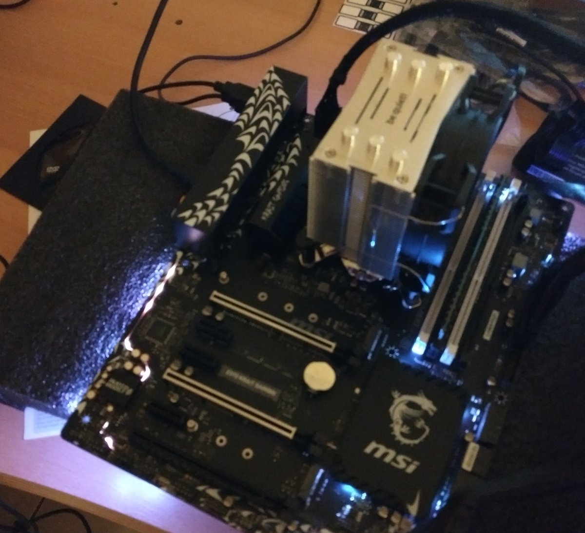 Mit dieser Minimalkonfiguration habe ich das System auf dem Testrack schon einmal gestartet und einen Blick ins BIOS geworfen. Alles paletti – CPU und Speicher werden 100% korrekt erkannt, der Lüfter läuft dank PWM unhörbar. Die LED Beleuchtung ist -für ein „nacktes“ RGB Board- erstaunlich dezent. Macht aber selbst so schon ein wenig her.