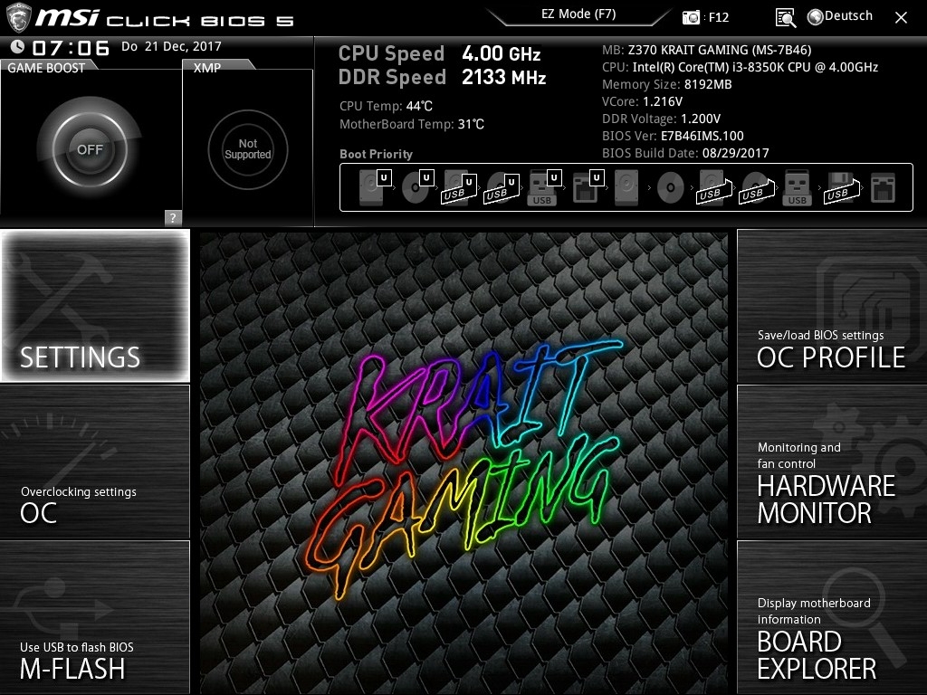Optisch ist das BIOS bis auf den Markenschriftzug eher grau in grau gehalten. Aber hier zählen vor allem die „inneren“ Werte und da gibt sich das Krait Gaming keine echte Blöße.