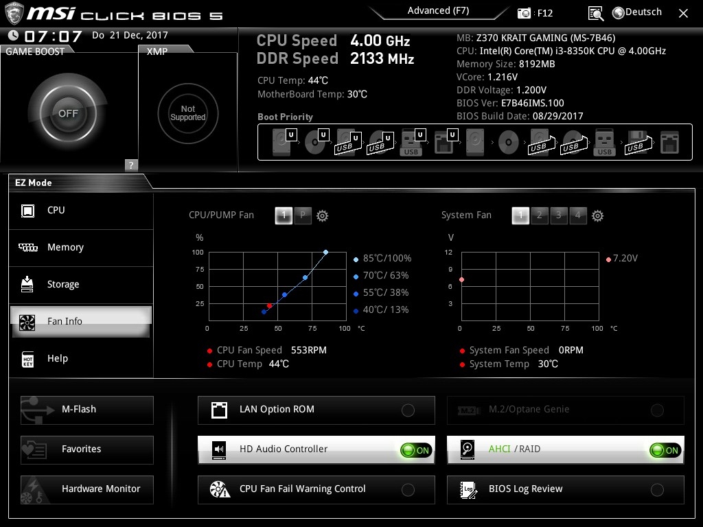 Die System Fans im BIOS sind standardmäßig auf den „DC Mode“ eingestellt, bei vorhandenen Gehäuselüftern mit PWM muss man dies manuell im BIOS umstellen. Das ist allerdings mit wenigen Klicks erledigt und wird im Handbuch des Boards auch explizit erwähnt.