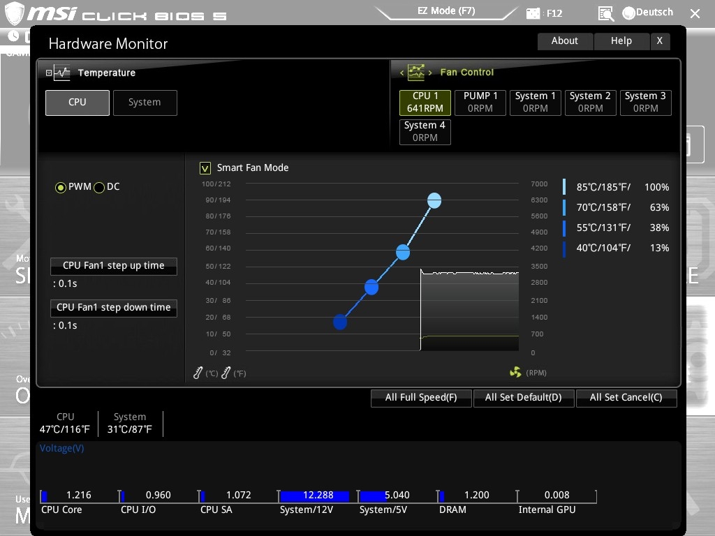 Für mich interessanter waren die Einstellungen bei der Lüftersteuerung, da ich viel Wert auf „ruhiges Arbeiten“ lege. Die Benutzeroberfläche ist hier grafisch gut aufbereitet und intuitiv bedienbar. Für die Lüfter lassen sich gezielt Temperaturprofile einrichten, der Hardwaremonitor bietet eine detaillierte Übersicht über Temperaturen und Lüfterdrehzahlen im System.