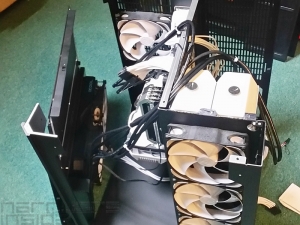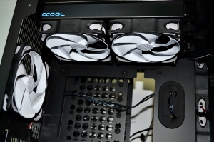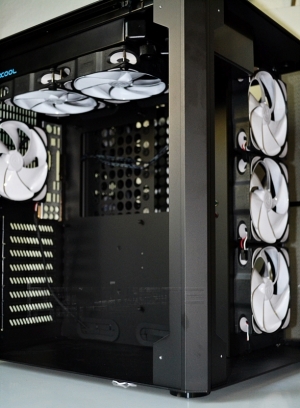 - Davon vorinstalliert: 3x 120 mm (Vorderseite, rechter Bereich) 2x 120 mm (HDD-Käfig, rechter Bereich) 1x 120 mm (Rückseite, linker Bereich)