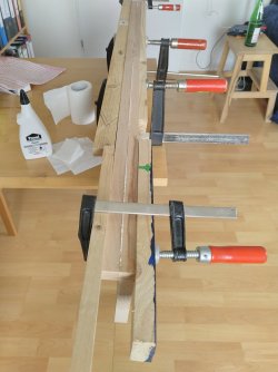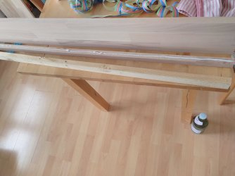 Ich leime jetzt gleich erstmal meinen Kabelkanal. Meine wunderschöne Buchenplatte wurde Freitag geliefert. 2 m x 80 cm x 2,8 cm. Das Teil für 125 EUR.
